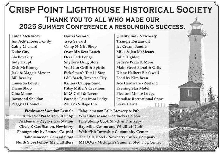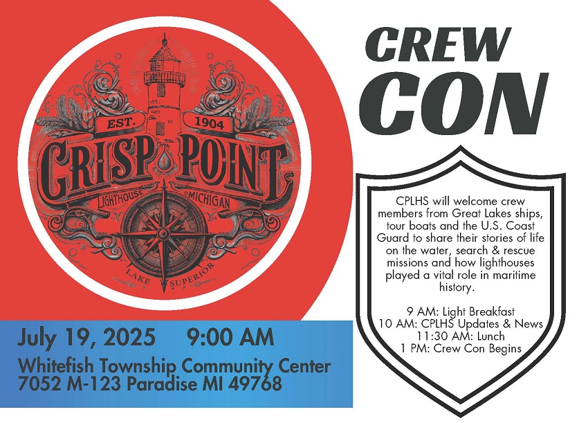 The 27th Crisp Point Lighthouse Conference is scheduled for July 19, 2025 (usually the third Saturday of July). We will meet at 9:00 a.m. for check-in and a light breakfast at the Whitefish Township Community Center, located at 7052 N. M-123, Paradise, MI 49768. We are planning a very special summer conference for this year with the Crew Con theme similar to last year. We will be giving everyone an update on the current happenings and future happenings at Crisp Point starting at around 10:00 a.m. Lunch will be around 11:30 am and we are excited to announce it will be catered again by a local business that specializes in "grazing tables"! We will have door prizes, a 50/50 raffle, and a silent auction with fabulous items!