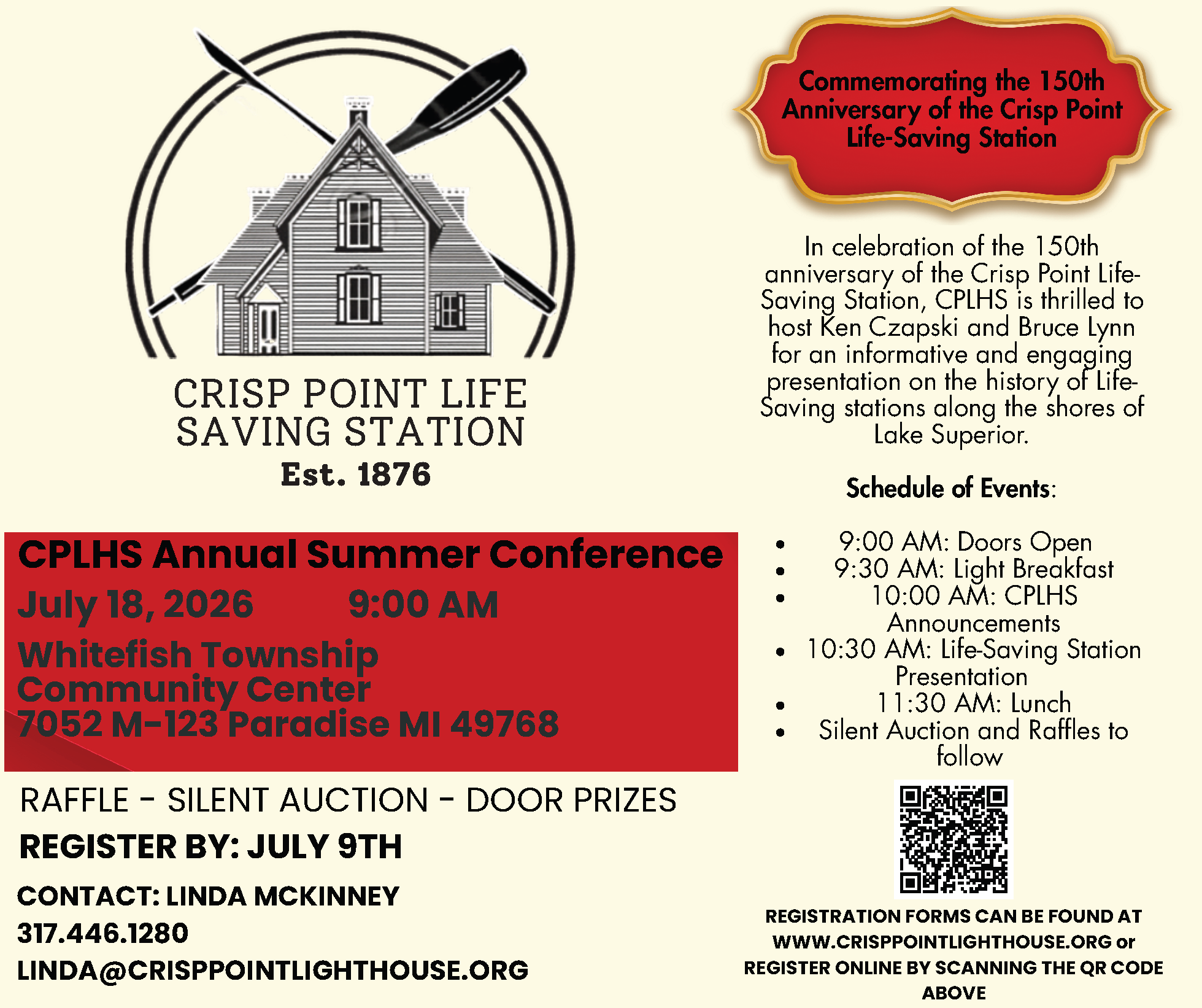 The 28th Crisp Point Lighthouse Conference is scheduled for July 18, 2026 (usually the third Saturday of July). We will meet at 9:00 a.m. for check-in and a light breakfast at the Whitefish Township Community Center, located at 7052 N. M-123, Paradise, MI 49768. We are planning a very special summer conference for this year. We will be giving everyone an update on the current happenings and future happenings at Crisp Point starting at around 10:00 a.m. Next we will have a presentation by Bruce Lynn and Ken Czapski about Life-Saving Stations that were on Lake Superior, with a big focus on Vermilion, which is the last station still existing of this architecture type. Bruce Lynn is the Executive Director at Great Lakes Shipwreck Museum at Whitefish Point. Architect Ken Czapski is a 2025 Michigan Historic Preservation Network (MHPN) Lifetime Achievement Award Honoree and a founding member of SOS Vermilion. Lunch will be around 11:30 am and it will be catered again by a local business.