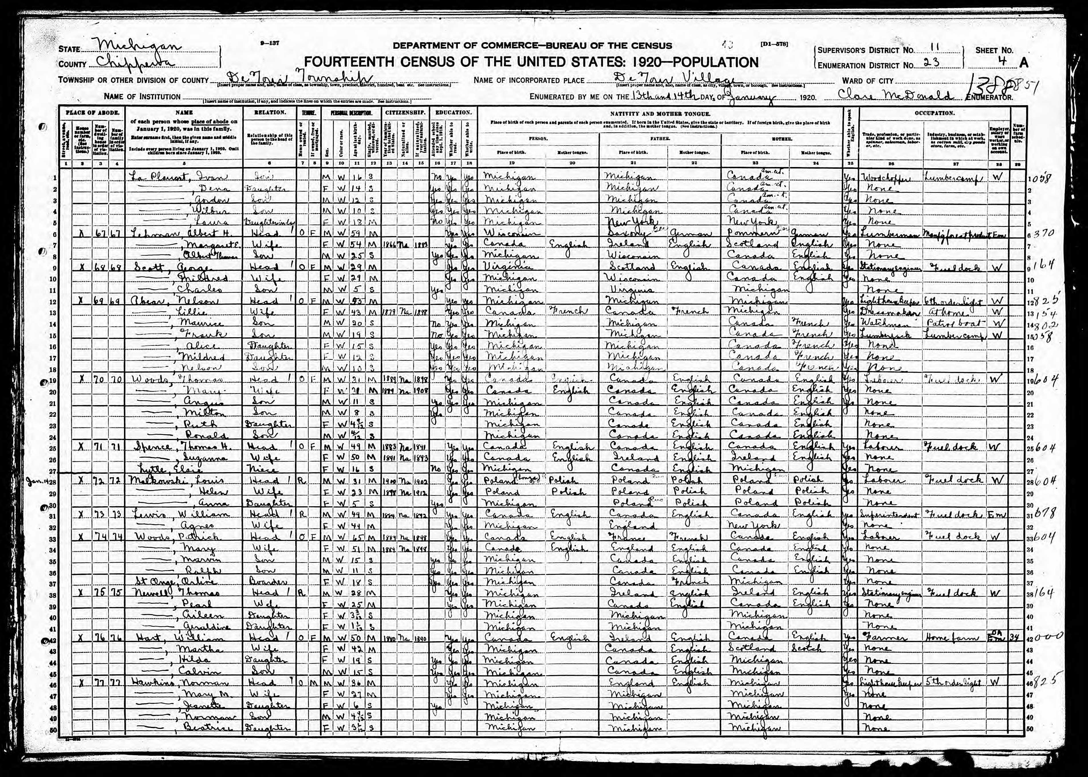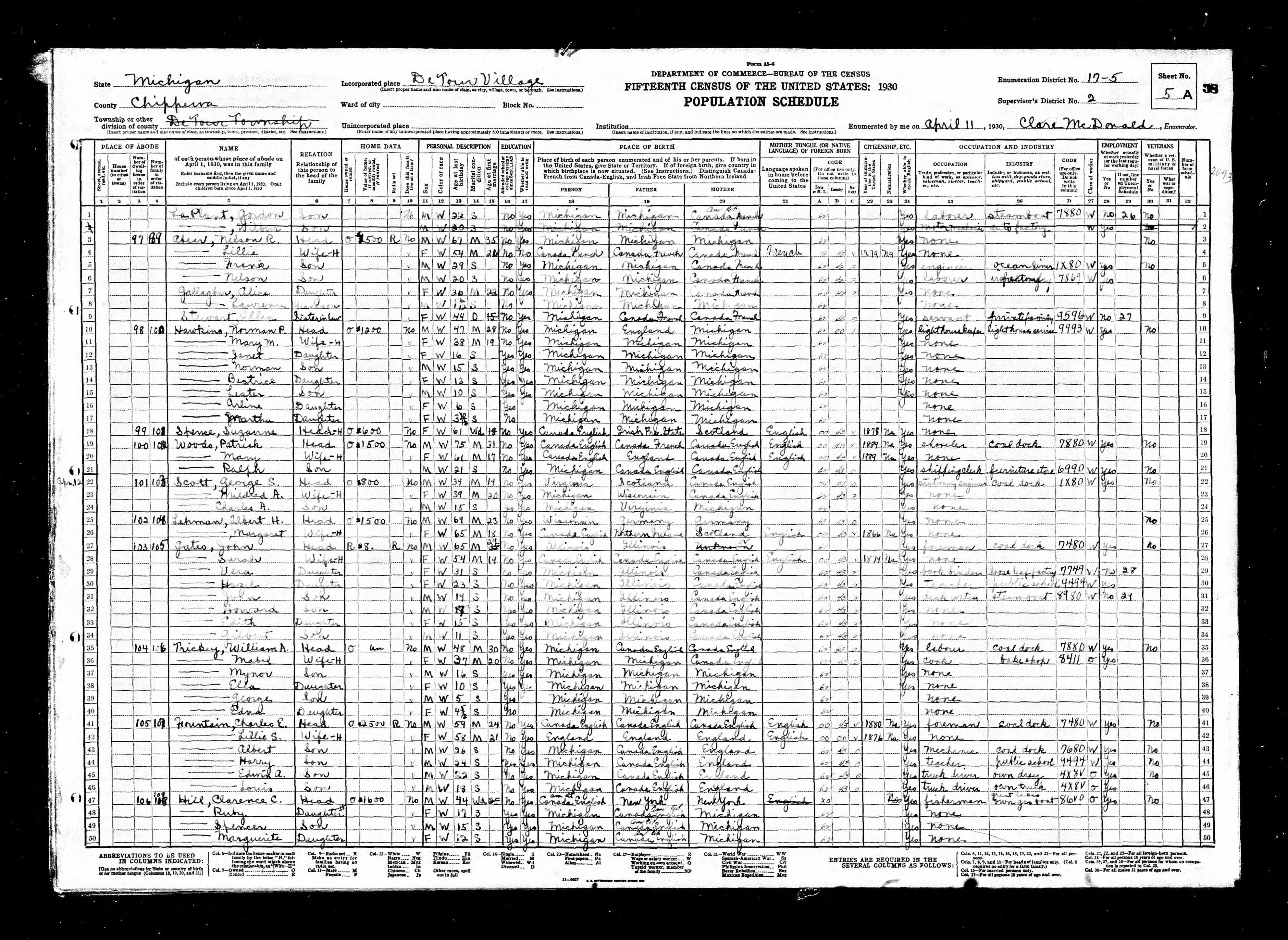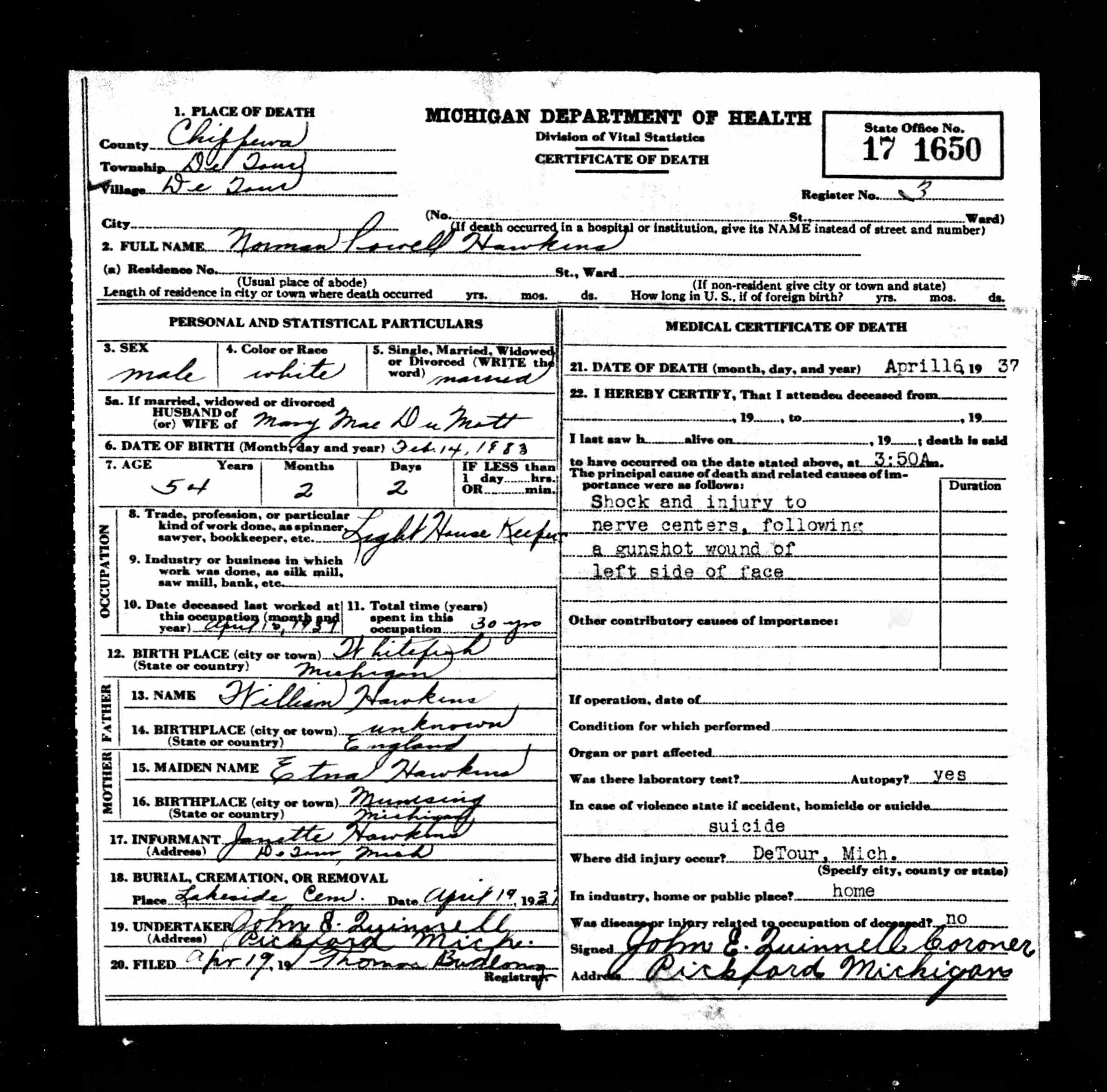 According to his Death Certificate, Norman passed away on April 16, 1937 in De Tour Village, Chippewa County, Michigan at the age of 54. His place of burial was in Riverside Cemetary in De Tour Village.