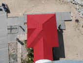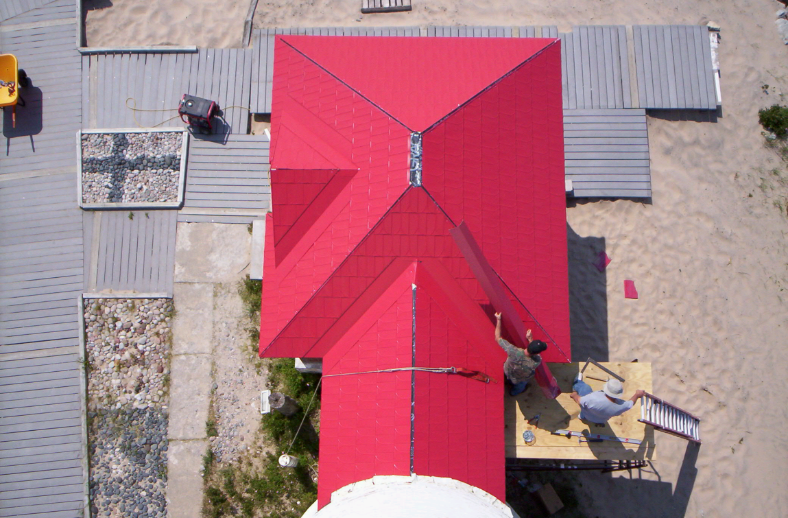 ![]() july2008brockway2.bmp (36 KB) Another photo from July 2008 by Rick Brockway, showing the new metal roof on the entrance building looking down from the lighthouse tower. |